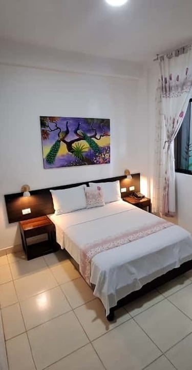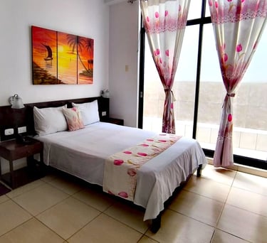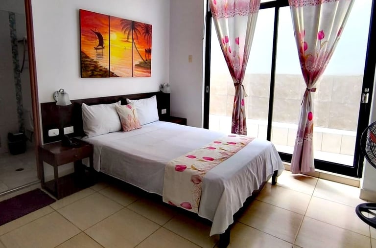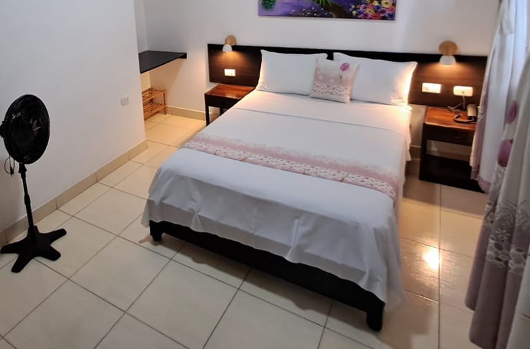 Habitación con una cama Queen para dos personas, aire acondicionado y baño privado, ideal para un descanzo inolvidable.