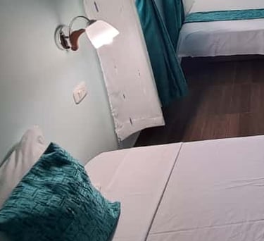Habitación con tres camas para tres o cuatro personas, aire acondicionado y baño privado, ideal para familia que desean un descanzo reparador.