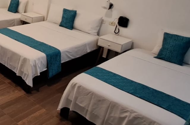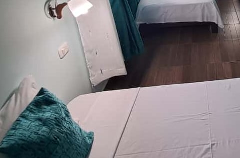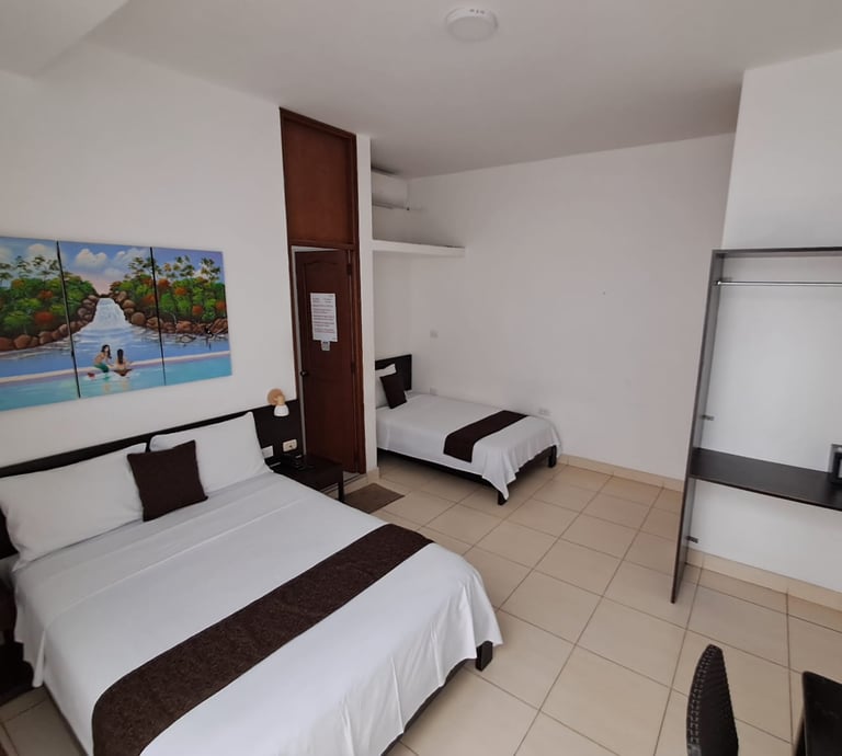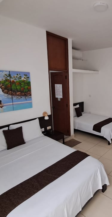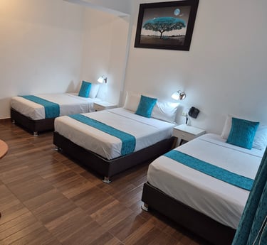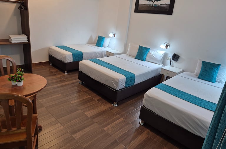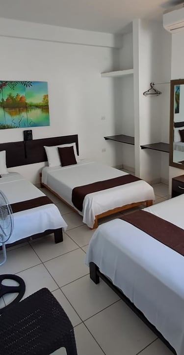 Habitación con tres camas para tres o cuatro personas, aire acondicionado y baño privado, ideal para familia que desean un estancia cómodo.