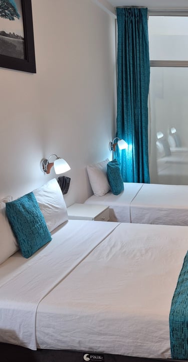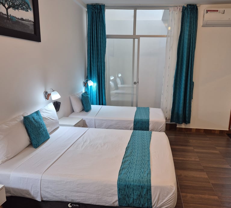 Habitación con dos camas de 2 plazas para dos, tres o cuatro personas, aire acondicionado y baño privado, ideal para familia con un descanzo privilegiado.